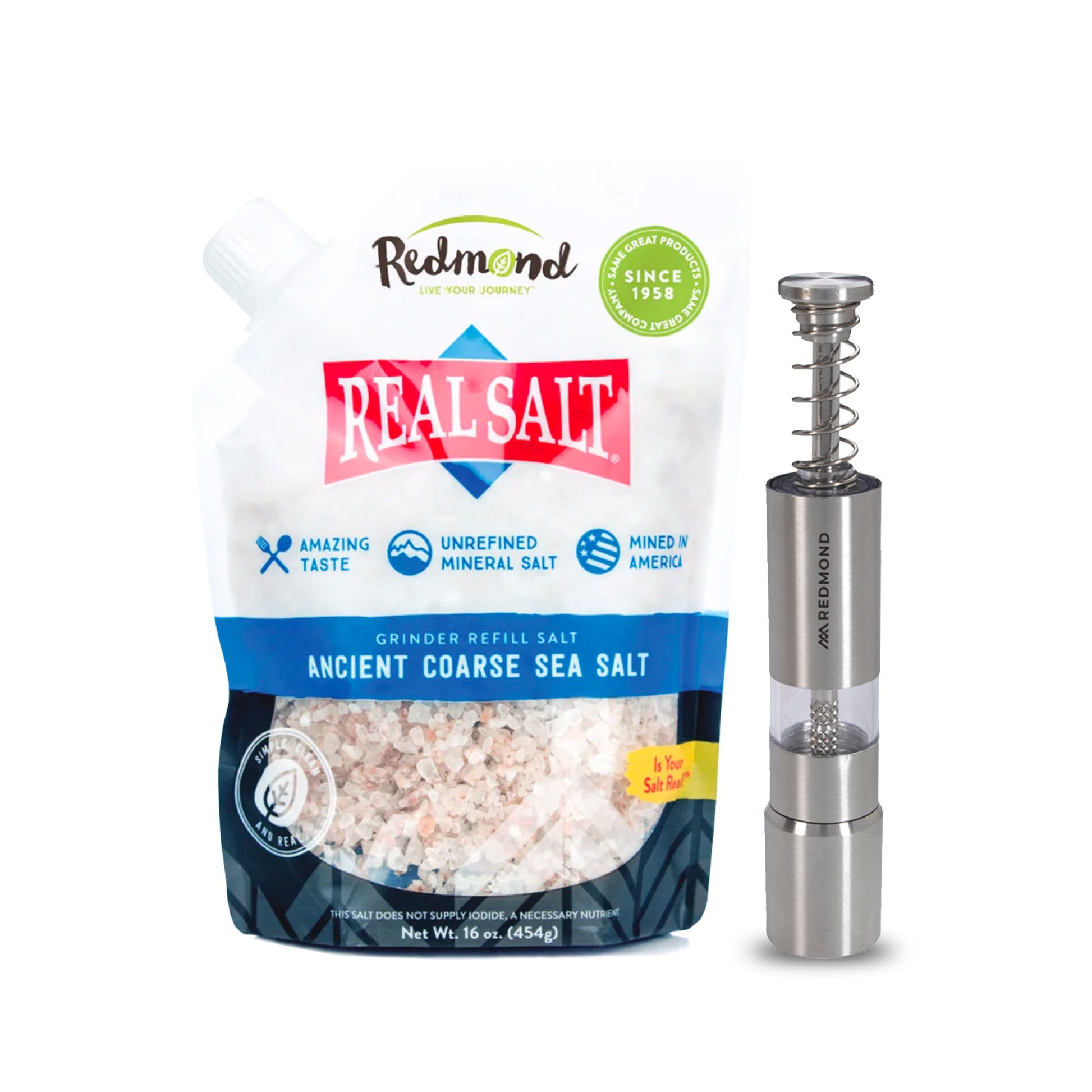 This limited-edition stainless steel salt grinder makes the perfect gift or stocking stuffer. Fill with Coarse Redmond Real Salt and season with the smooth, thumb-operated button.