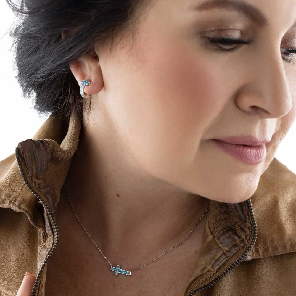 Keep your faith close and add a pop of color with this cross jewelry set. Light blue synthetic stones wrap the cross, with a matching sideways cross pendant for a unique silhouette.