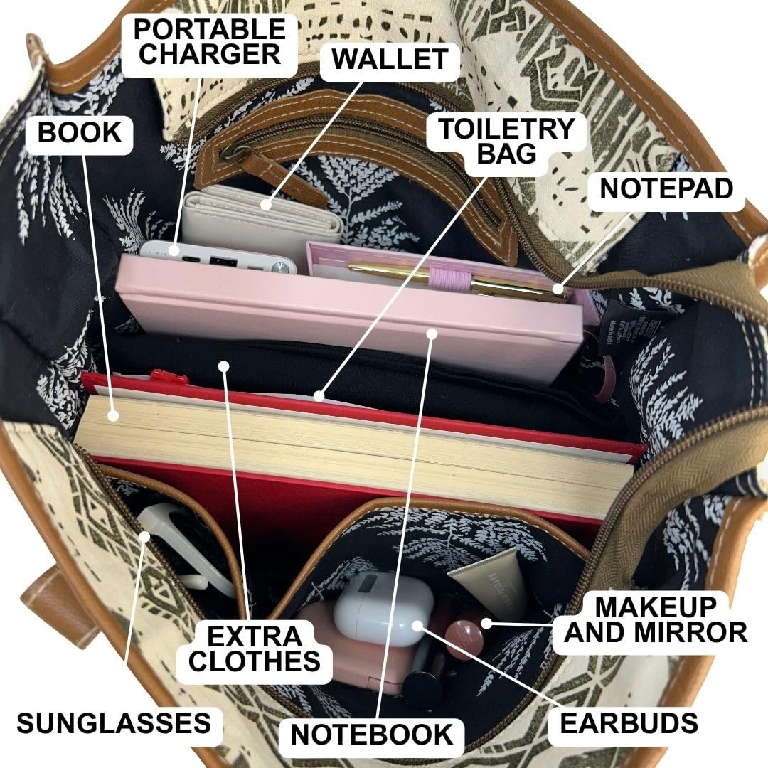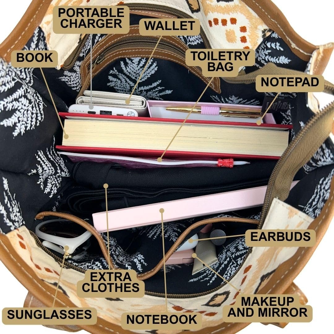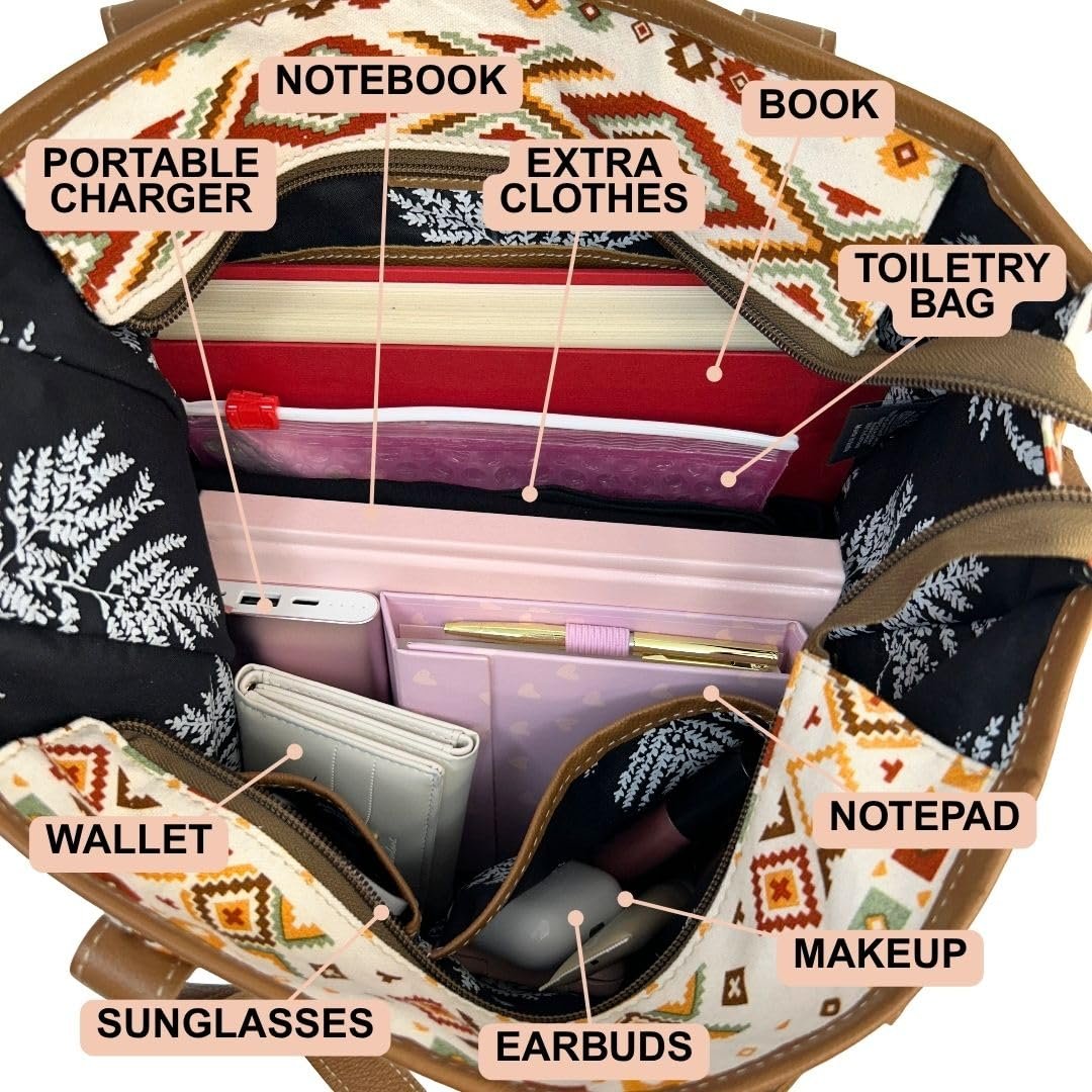 Boho concealed carry tote with Aztec motif, leather trim, and organized storage.