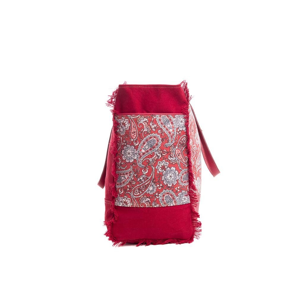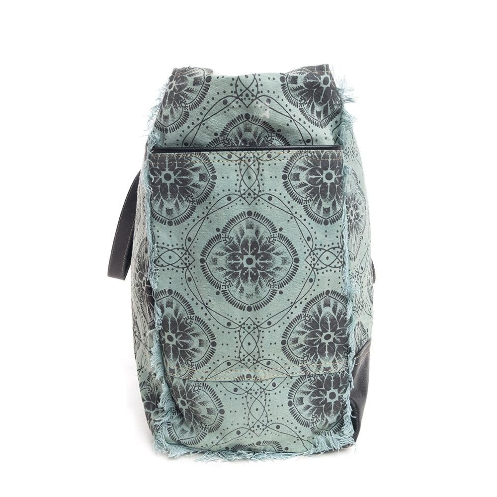 Effortless style for weekends away. This upcycled canvas weekender showcases a serene teal medallion pattern, finished with an ebony leather accent and frayed-edge detailing.