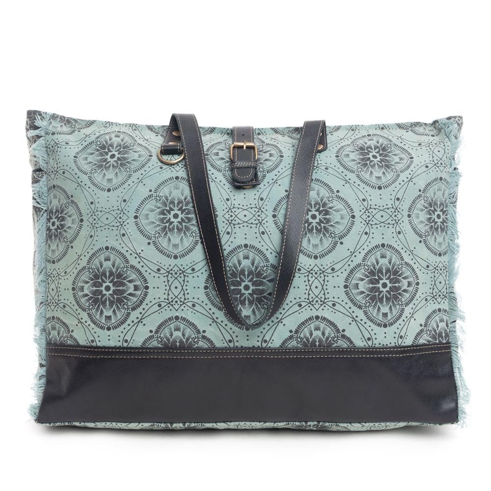 Effortless style for weekends away. This upcycled canvas weekender showcases a serene teal medallion pattern, finished with an ebony leather accent and frayed-edge detailing.