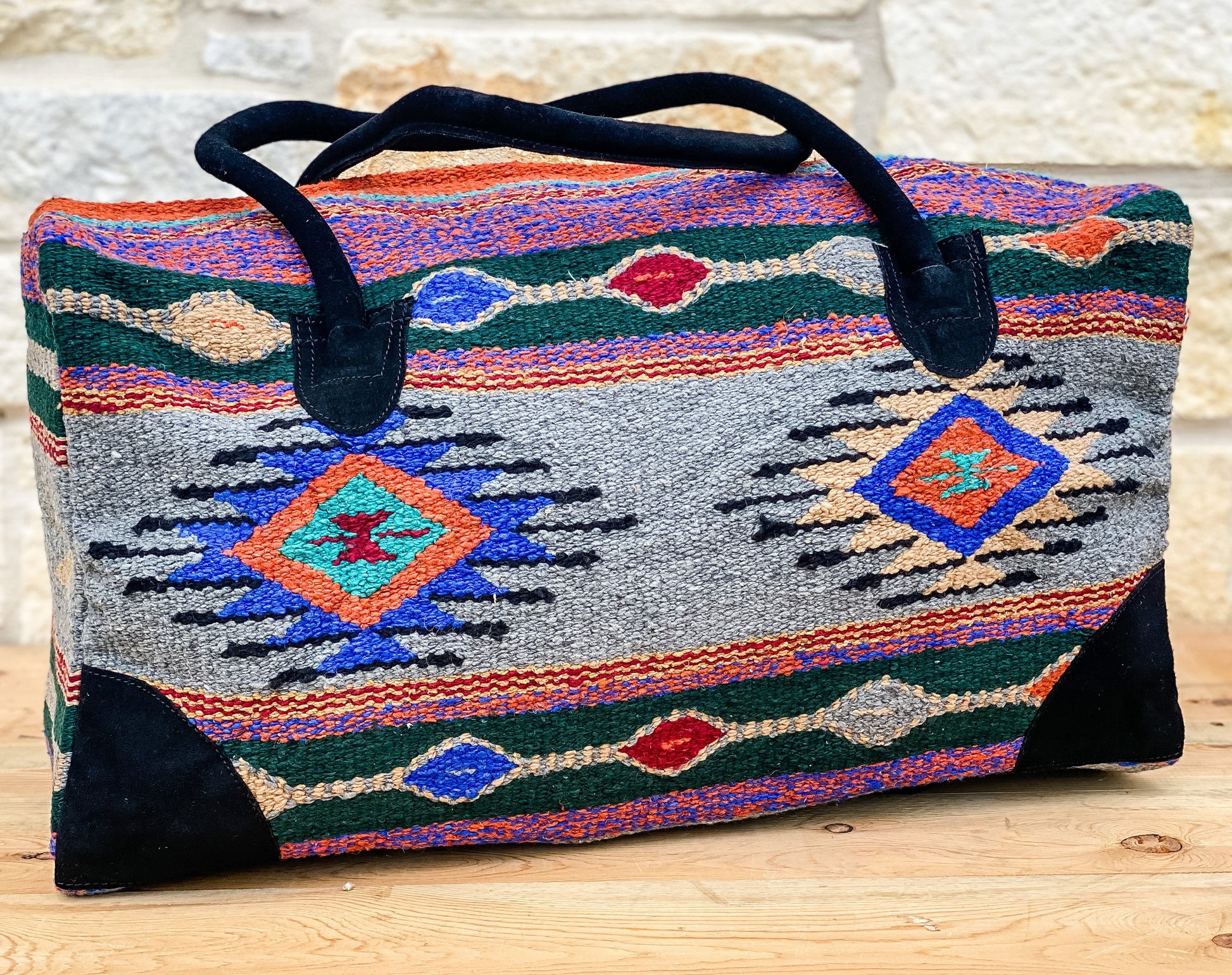 Large southwest Weekender travel Bag. The perfect traveling companion! Made with beautiful durable blanket style fabric with southwestern Aztec design, fully lined center compartment allows for flexible packing and the sizeable inside pocket keeps smaller items at hand. Suede handles and accent corners with 4 plastic feet to keep the bottom clean. 70% Acrylic, 30% Polyester. 70% Acrylic, 30% Polyester. Dry cleaning recommended. Features: